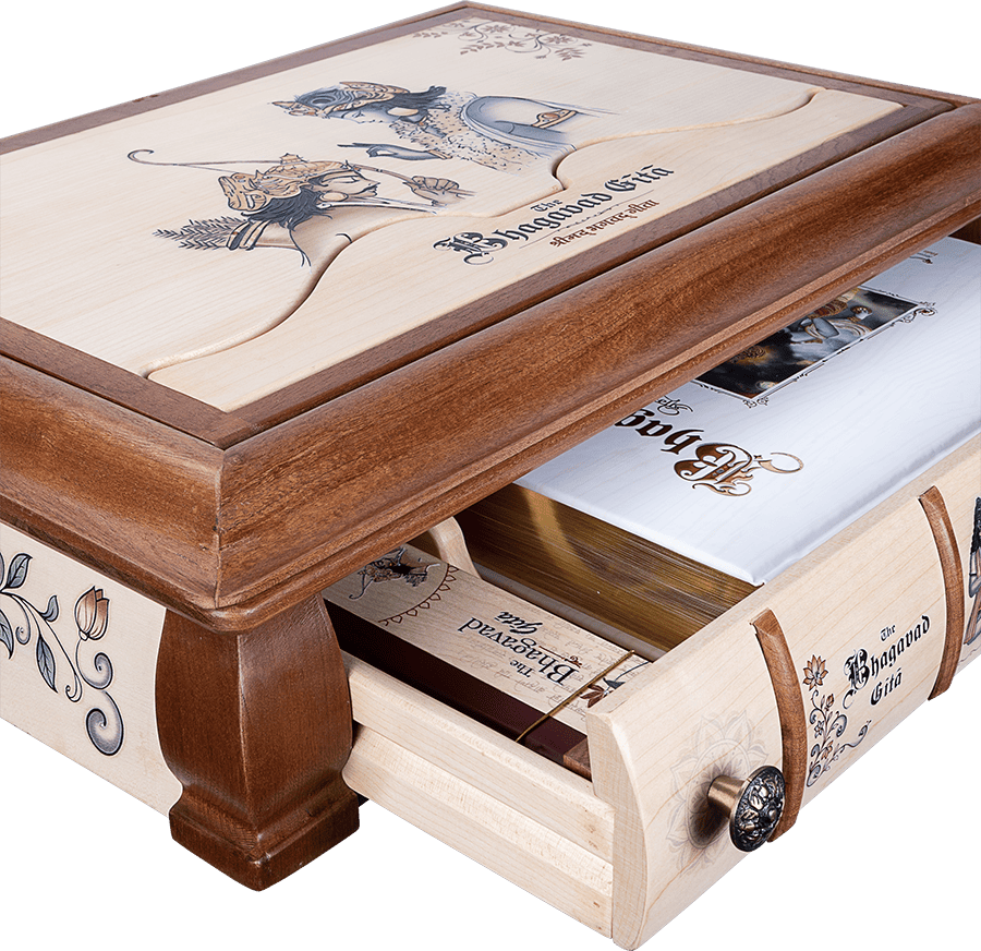 The treasures within this mystical hut reveal themselves as you open the finely crafted drawer, which cradle the Bhagavad Gita alongside the ลloka book. The front face of drawer, intricately designed with an antique book spine-inspired style and fine carved wooden ribs, captures the essence of ancient wisdom and artistry.